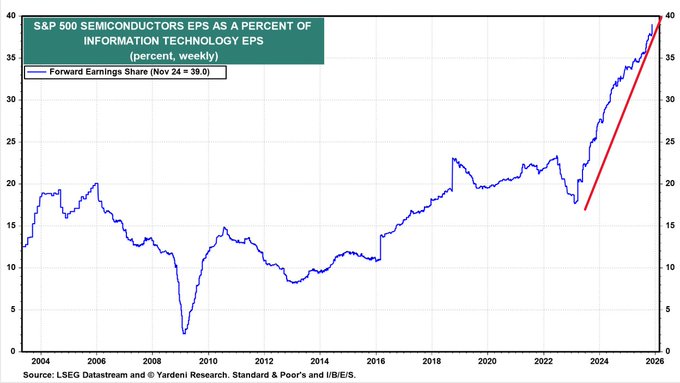 从2024年开始,半导体基建正在飞速吞噬整个IT产业利润,SP500里半导体净利润EPS在IT行业里占比,在两年时间从不到20%上升了到了40%,而且还在呈加速上升姿态