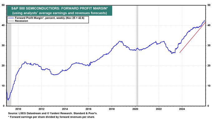 半导体整体前瞻利润率从2023年的25%已经升到了2025年11月的43%,已经明显超过了几个互联网巨头的平均利润率,这也印证了半导体利润率超过互联网会是新常态。整个IT产业的利润分配,流向半导体的比例越来越大。